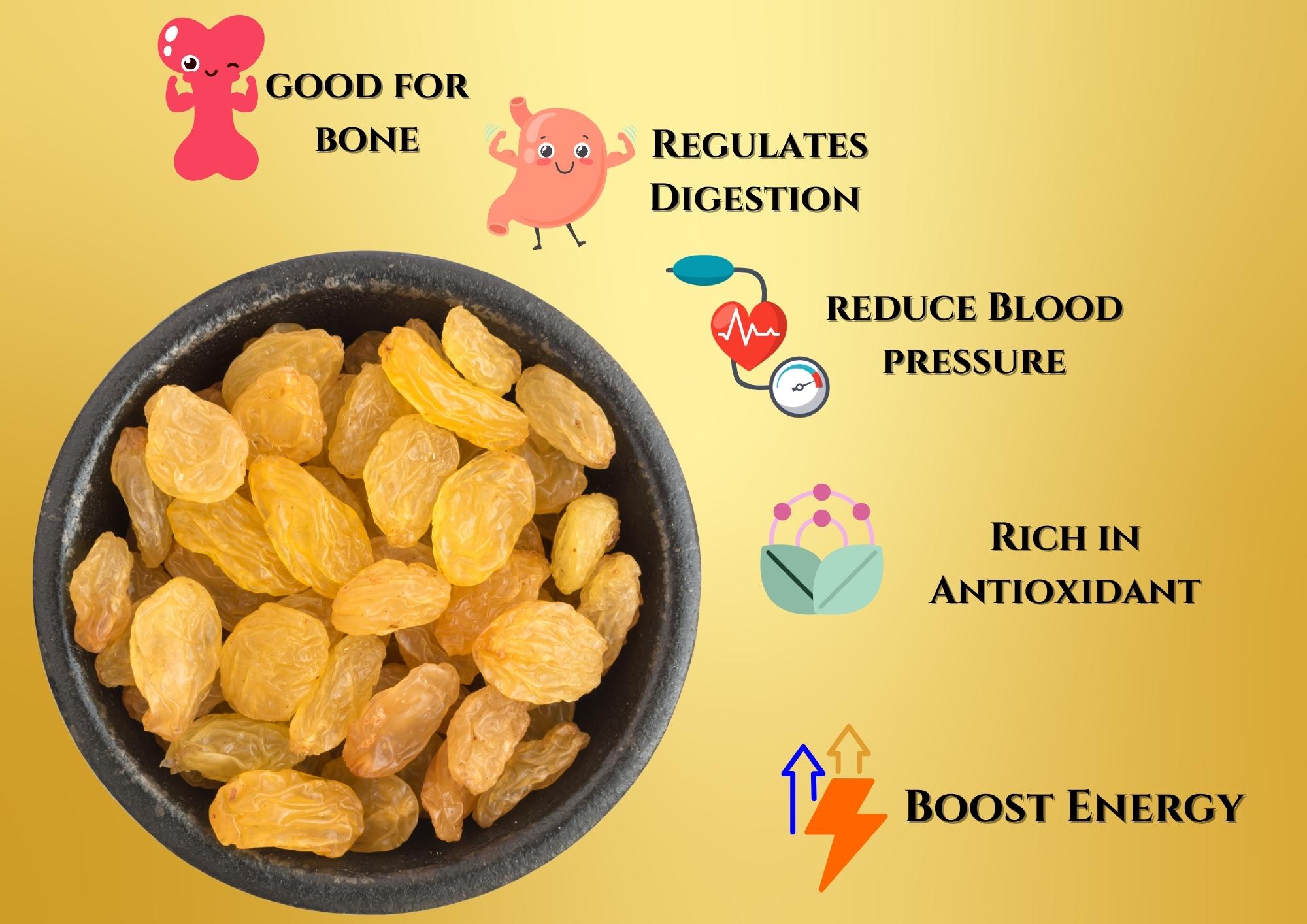 Golden dry raisins, also known as golden raisins, offer a range of health benefits: